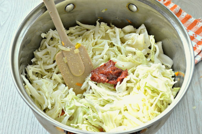- Vervolgens zetten we tomatenpuree. Voeg zout toe en voeg naar smaak zwarte peper toe. Meng alles door elkaar en laat met gesloten deksel tien tot vijftien minuten sudderen. Gedurende deze tijd zal de kool merkbaar bezinken.