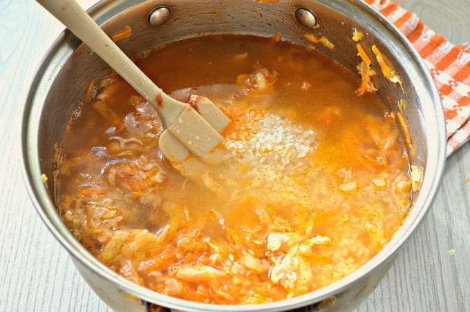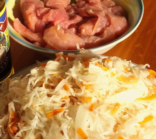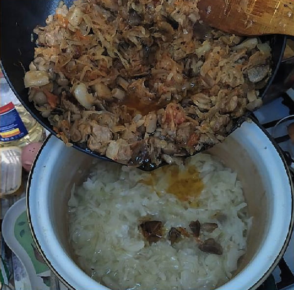 - Knijp zuurkool uit overtollig vocht. Als de kool te zout of te zuur is, spoel hem dan af met water en knijp hem uit. Voeg bereide zuurkool toe aan de pan met vlees en champignons. We zetten ook adjika, mosterd en pimenterwten. Roer en laat nog tien minuten sudderen.