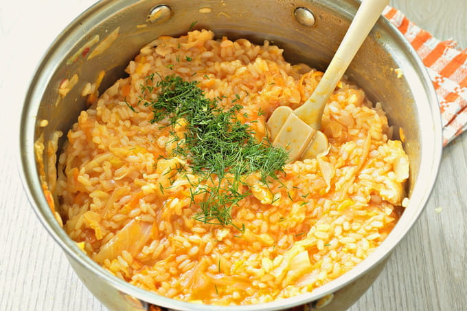 - Als de rijst helemaal zacht is, haal je de pan van het fornuis. We wassen de greens, hakken ze fijn met een mes en voegen ze toe aan de kool.