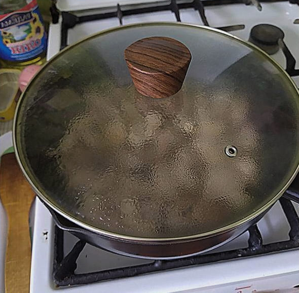 - Wanneer het vlees bedekt is met een korst, giet er heet water in in een zodanige hoeveelheid dat de bodem bedekt is met een laag van twee tot drie millimeter. We sluiten de pan met een deksel en sudderen het vlees ongeveer een uur op een minimale temperatuur. Het is belangrijk dat de vleesvezels helemaal zacht worden en beginnen af te breken.