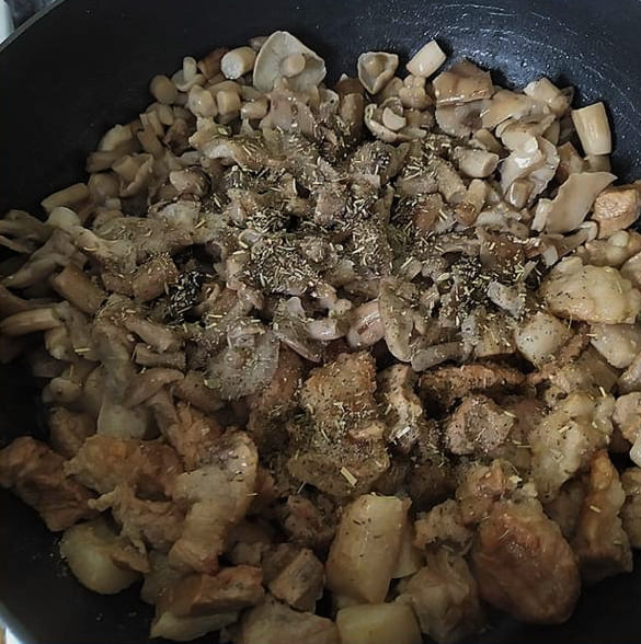 - Voeg na het verstrijken van de aangegeven tijd champignons voorgekookt en geperst uit overtollig vocht toe aan het vlees. En ook droge Provençaalse kruiden, zout en zwarte peper naar smaak.