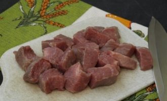 - Was het varkensvlees zonder been, snij in stukjes "voor één hap", bak in plantaardige olie, zodat er een korst verschijnt, op hoog vuur. Bak in een dikwandige pan, af en toe roerend, tot het vlees aan alle kanten korst.