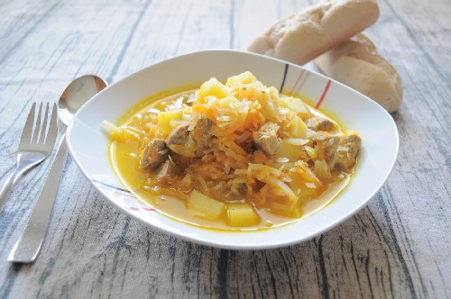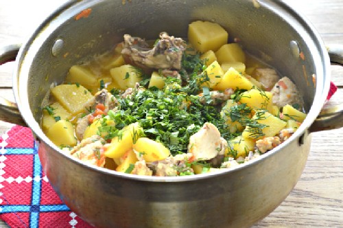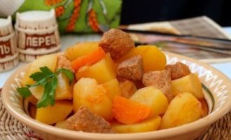 - Doe alle gebakken ingrediënten in een dikwandige pan, bestrooi met zout en kruiden naar smaak, giet er een beetje heet water bij en laat sudderen tot het vlees en de aardappelen gaar zijn.