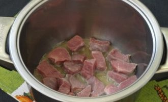 Het is het beste om te beginnen met koken in een pan met een zware bodem, waar het gebraad volledig is gedoofd. Verhit er een klein scheutje olie in en bak de stukken vlees tot een mooie korst. Dit moet op hoog vuur worden gedaan, de hele tijd roeren, zodat het vlees niet meteen stooft, maar grijpt met een korst - zodat de stukjes van binnen sappig blijven.