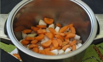 - Voeg vervolgens wortels en uien toe aan het vlees, bak alles samen, al roerend, in plantaardige olie gedurende niet meer dan 3-5 minuten.