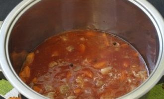 Los de tomatenpuree op in een glas kokend water, giet het in een pan, voeg zout toe, voeg peperkorrels toe en laat het vlees minimaal 20-30 minuten sudderen (als je rundvlees hebt, kan het 40-45 minuten worden gestoofd). Laat sudderen op matig vuur, af en toe roeren.