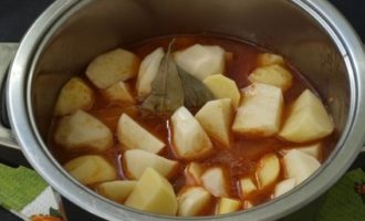 Als het vlees gemakkelijk te doorboren is met een vork, voeg dan de aardappelen, laurierblaadjes, vleeskruiden en nog wat kokend water toe. Laat het gebraad sudderen tot het vlees en de aardappelen gaar zijn, afgedekt. Het vuur is klein, roer van tijd tot tijd om niet te verbranden.