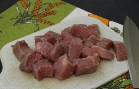 - Was het varkensvlees zonder been, snij in stukjes "voor één hap", bak in plantaardige olie, zodat er een korst verschijnt, op hoog vuur. Bak in een dikwandige pan, af en toe roerend, tot het vlees aan alle kanten korst.
