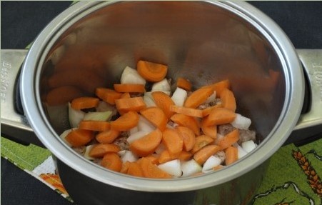 - Voeg vervolgens wortels en uien toe aan het vlees, bak alles samen, al roerend, in plantaardige olie gedurende niet meer dan 3-5 minuten.