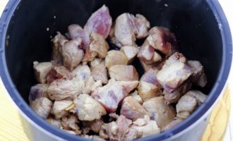 - Giet plantaardige olie in de kom van de multikoker, leg de gehakte stukken vlees.