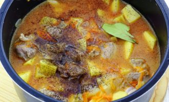 - Sluit de slowcooker en kook de gestoofde aardappelen met vlees onder het deksel in het programma Stoofpot gedurende 60 minuten (meer als je taai vlees hebt).