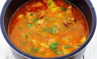 - Als de groenten tijdens het frituren geen sap zijn geworden, voeg dan ongeveer 1 glas water toe aan de multicooker.