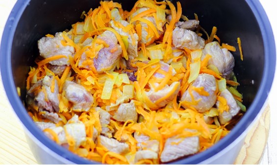 - Stel het programma "Fry" in, sluit het deksel en bak de inhoud van de multicooker gedurende 10-15 minuten (u kunt ook frituren met het deksel open, terwijl u het vlees en de groenten roert).