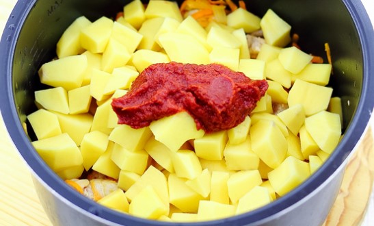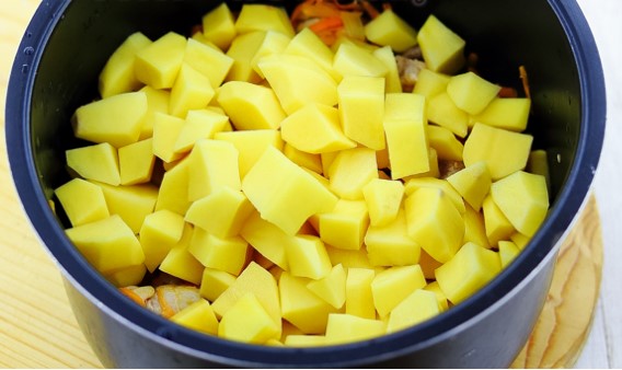 Terwijl vlees en groenten worden gebakken, schil je de aardappelen, was je ze en snijd je ze in middelgrote repen of blokjes, en voeg je ze toe aan de multicookerkom.