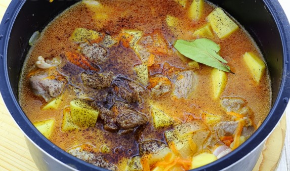 - Wanneer de pieptoon klinkt, stoom afblazen en proef het gerecht. Hoogstwaarschijnlijk is een uur voldoende om het te koken. Als de aardappelen en het rundvlees nog vochtig zijn, laat de schaal dan nog een kwartier sudderen onder het deksel.