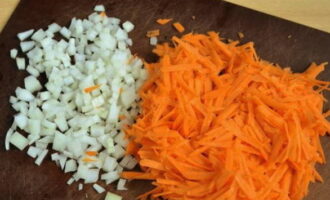 Laten we de uien en wortels voorbereiden om te frituren. We schillen de ui, snijden hem in twee delen. Maal elk deel in kleine blokjes. Ook maken we de wortelen schoon en spoelen ze af met warm water om vuil te verwijderen. We wrijven het op een grove rasp in een diepe kom.