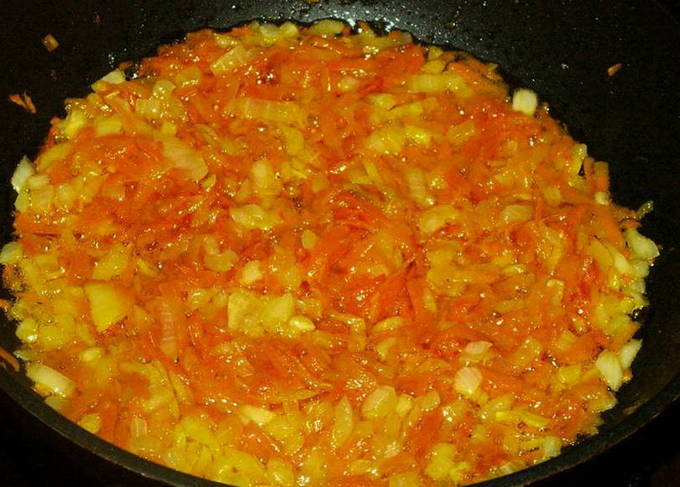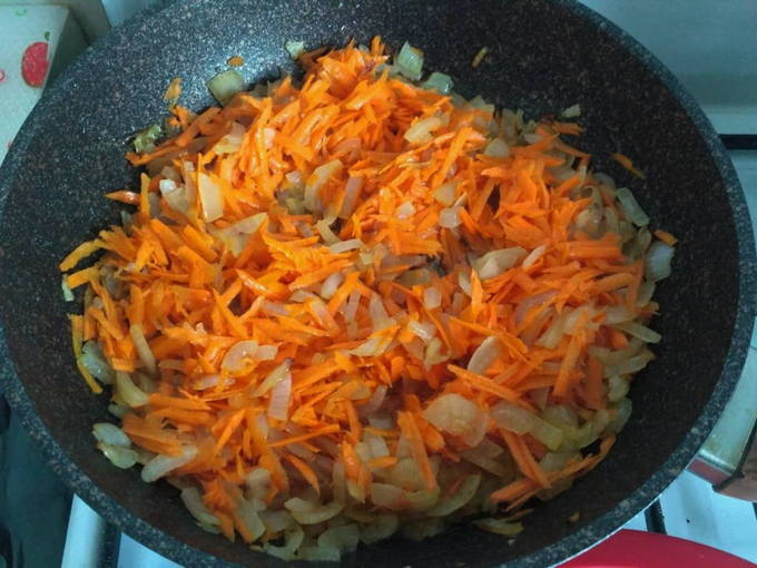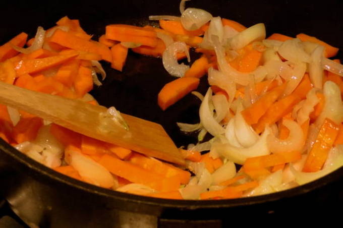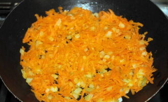 - Giet plantaardige olie in een diepe koekenpan. We zetten de container op de brander en zetten het fornuis aan. Verwarm ongeveer een minuut en voeg de ui toe. Bak het goudbruin. Vervolgens sturen we wortelen. Roer dit door de ui en bak een paar minuten tot de wortelen zacht zijn.