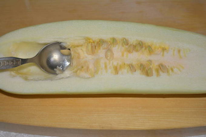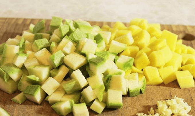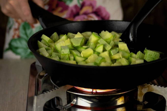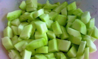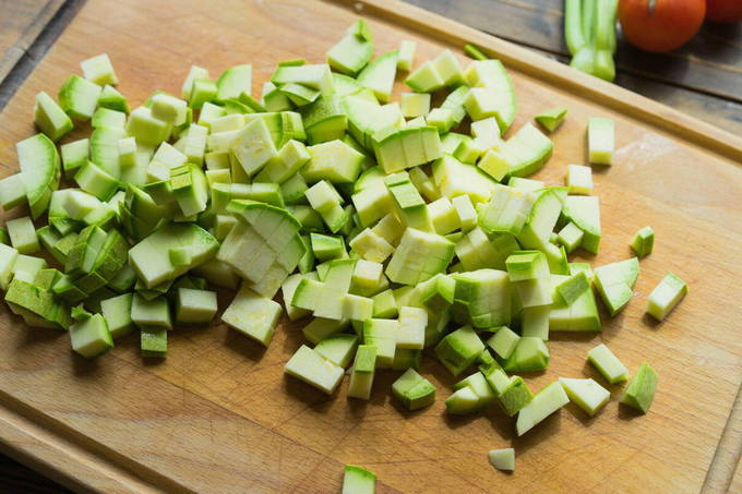 - We spoelen de courgette af met warm water en vegen hem af met een theedoek. Verwijder de schil met een mes. Als de courgette jong is, mag de schil niet worden verwijderd, omdat deze erg dun en sappig is. Boen de courgettekern schoon met een lepel. Snijd de courgette in middelgrote blokjes.