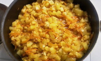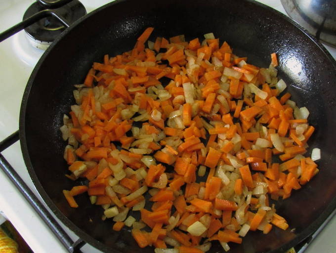 - We schillen de wortelen met een klein mes. We wassen het met warm stromend water. Snijd de groente in kleine blokjes. Voeg wortelen toe aan uien en bak ze 2-3 minuten. Roeren.