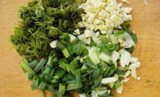 - We wassen de courgette en greens. Droog ze af met een papieren handdoek. We ontdoen ons van de knoflookschil. Snijd de schil van de courgette, halveer en verwijder het klokhuis. Maal de courgette in blokjes. Hak eerst de knoflook fijn en daarna de peterselie.