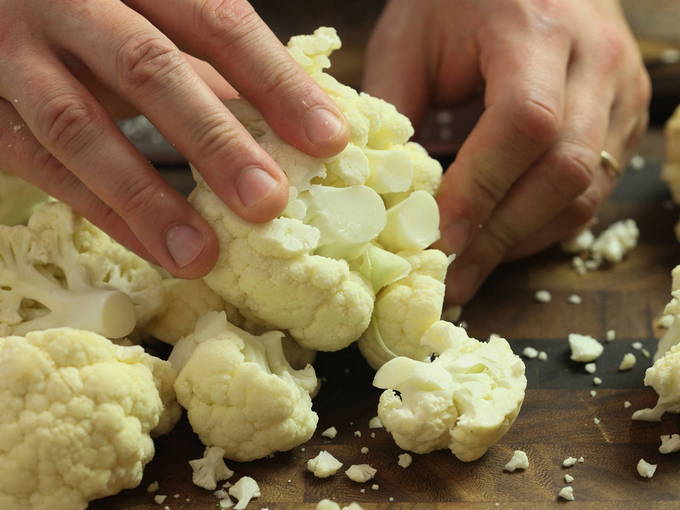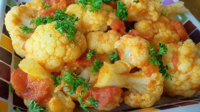 - We wassen de tomaten en kruiden, vegen ze af met een papieren handdoek. Wrijf de tomaten op een fijne rasp. Snijd de greens zo klein mogelijk. Verplaats de bloemkool naar de pan. Vul de massa met geraspte tomaten. We wachten tot de groenten aan de kook komen. Bestrooi met zout, peper en kruiden. Roer tot een gladde massa en laat 3-4 minuten sudderen.
