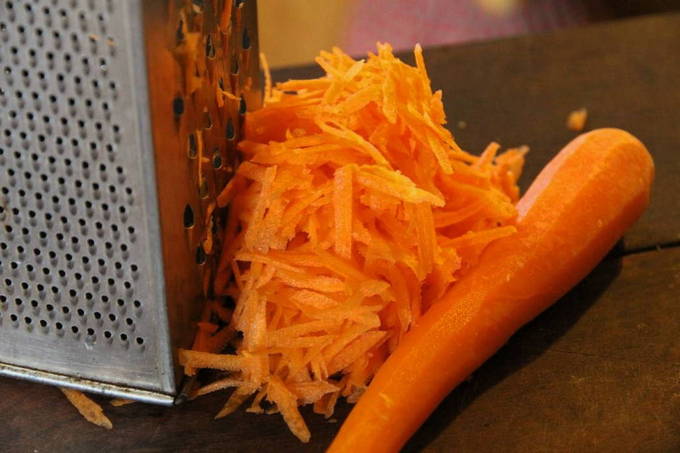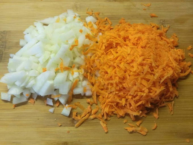- We schillen de ui van de schil en de wortelen van de bovenste laag. We wassen de wortels in warm water. Snijd de ui in kleine stukjes en rasp de wortelen op een grove rasp.