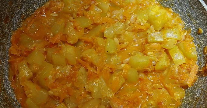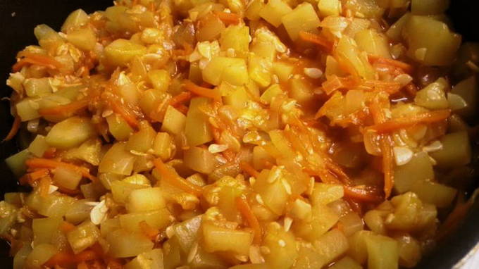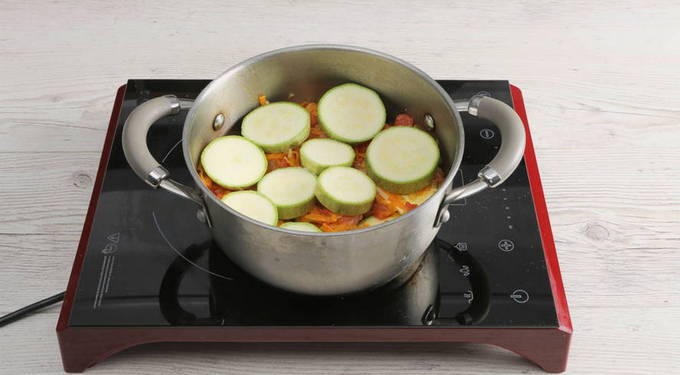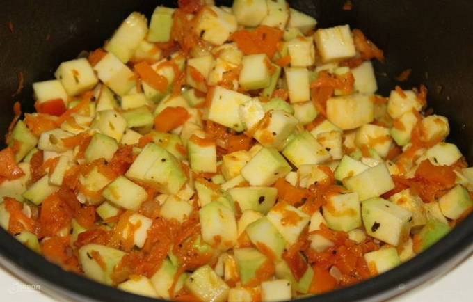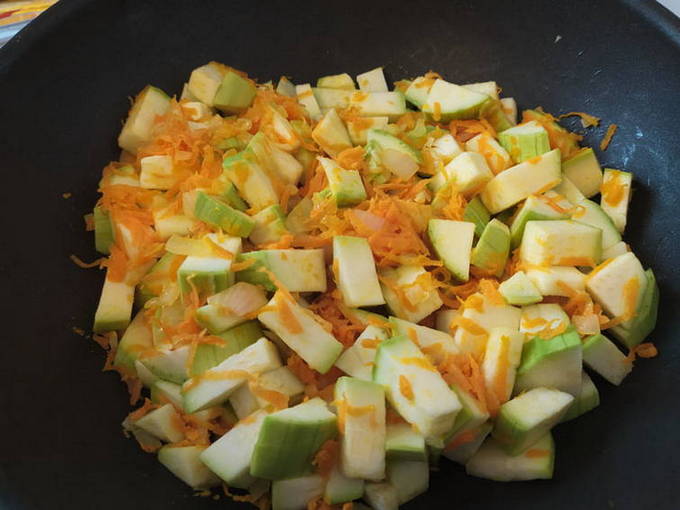 - We wassen de courgette, vegen ze af en snijden de schil eraf. Maal de groente in blokjes. Giet de courgette bij de uien en wortels. Bak de ingrediënten gedurende 3 minuten, roer constant. Zet het vuur lager, voeg wat water toe. Bedek de pan met een deksel en laat het voedsel 10-15 minuten sudderen.