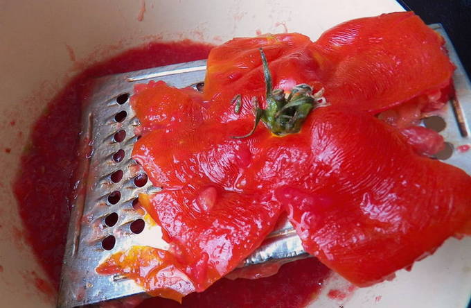 - We wassen de tomaten. We verspreiden de tomaten in een diepe bak en vullen met kokend water (kook water in een waterkoker of in een pan op het fornuis). We wachten een paar minuten. We verplaatsen de tomaten in ijswater. Daarna verwijderen we de huid. Snijd het vruchtvlees in kleine blokjes.
