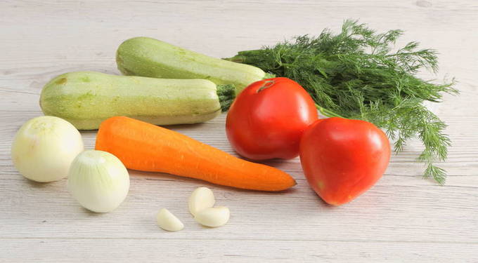 - Laten we eerst alle ingrediënten voorbereiden. Pel de ui en knoflook van de schil en films. Verwijder de wortelschil met een mes. We wassen de wortels met warm water met een spons of borstel. We wassen tomaten, dille en courgette. Droog ze af met een servet of keukenpapier.