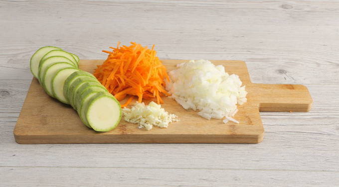 - Snijd de ui en knoflook fijn. Maal de wortelen op een grove rasp. We verspreiden de afgewerkte ingrediënten op verschillende borden. Snijd de courgette in plakjes van gemiddelde dikte en doe ze ook in een aparte bak.