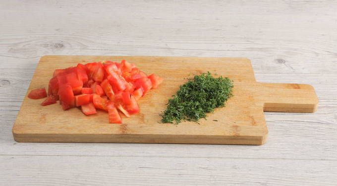 - Giet koud water in een waterkoker en breng aan de kook. Doe de tomaten in een diepe bak en giet er kokend water over. Giet na een paar minuten het water weg, laat de tomaten afkoelen en verwijder het vel. Snijd het vruchtvlees in kleine blokjes. Hak de dille.