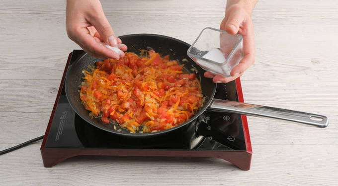 - Giet twee eetlepels olijfolie in de pan. We zetten de container op de brander en zetten het fornuis aan om op te warmen. Voeg na een paar minuten de ui en knoflook toe. Bak ze goudbruin. Roer constant met een spatel. Voeg wortelen toe. Bak de ingrediënten ongeveer 5-7 minuten en roer constant. We sturen tomaten naar de pan. Bak de massa 10 minuten. Bestrooi met peper en zout naar smaak.