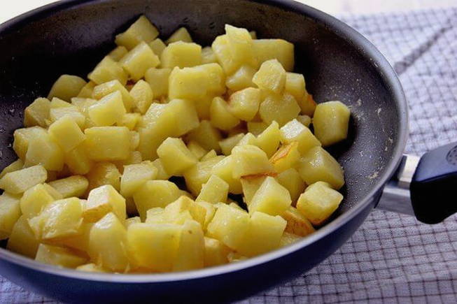 - Giet de zonnebloemolie in de pan en zet deze op de brander. We zetten het fornuis aan en warmen het ongeveer een minuut op. Schenk de aardappelblokjes erbij en bak mee.