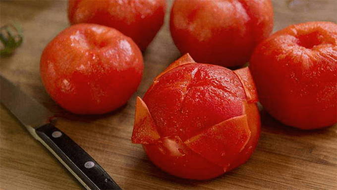 - We wassen de tomaten.We doen ze in een diepe kom. Giet water in de waterkoker, breng aan de kook (als er geen waterkoker is, kook dan water op het fornuis). Giet de tomaten met kokend water en laat 2 minuten staan. Na een paar minuten dompelen we ze in ijswater en verwijderen dan gemakkelijk de schil. We verwijderen de plaats waar de stengel is bevestigd. Snijd de tomaten in middelgrote blokjes.