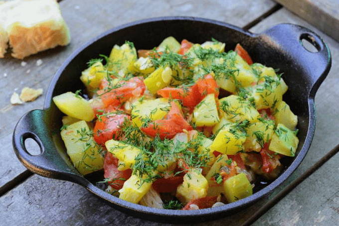 - Dek de schaal af met een deksel en laat 30-40 minuten op laag vuur sudderen. We wassen de dille met water en drogen deze. Maal de greens. Bestrooi het afgewerkte assortiment ermee en serveer.