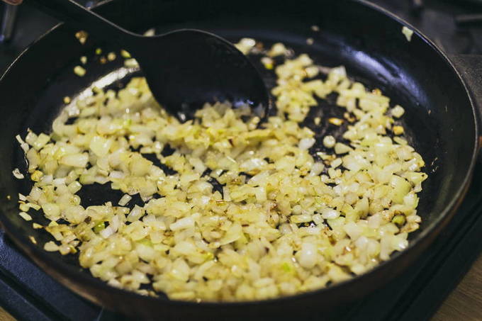 - Schil de ui en snijd hem in kleine blokjes. Giet de olie in de pan en plaats de container op de brander. We zetten de kachel aan. Verwarm een koekenpan ongeveer een minuut voor met olie. Fruit de uien op hoog vuur tot ze goudbruin zijn. Roer constant met een spatel.