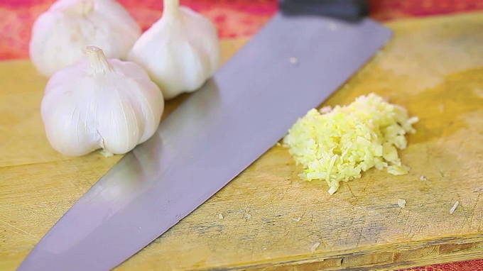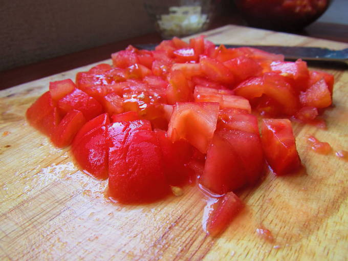 - Pel de knoflook en hak deze fijn. Voeg gehakte tomaten en knoflook toe aan de pan. Zout en peper naar smaak. Roer de inhoud van de container en laat 10 minuten staan. Niet afdekken met een deksel.