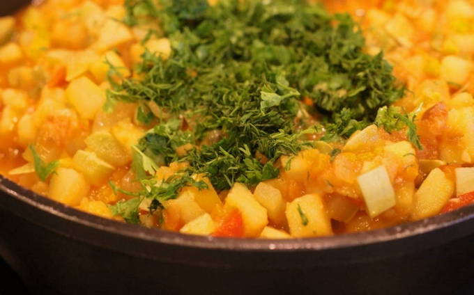 - We verspreiden de courgette in het mengsel. Dek de pan weer af en laat ongeveer 7 minuten sudderen. We wassen een bosje dille, drogen het en hakken het fijn. Bestrooi het afgewerkte gerecht ermee.