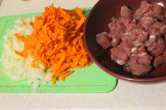 - Schil de uien en wortelen. We wassen de wortelen met warm water en hakken (op een rasp of met een mes) in kleine blokjes of rietjes. Snijd de ui zo klein mogelijk. Spoel het varkensvlees en snijd het in middelgrote blokjes.