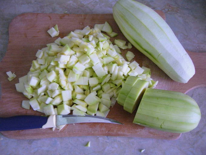 - We spoelen de courgette af en vegen deze af met keukenpapier of keukenpapier. Snijd de groente eerst in ronde plakken en daarna in kleine blokjes. Als de courgette "oud" is, moet de schil worden verwijderd en het klokhuis eruit worden gesneden.