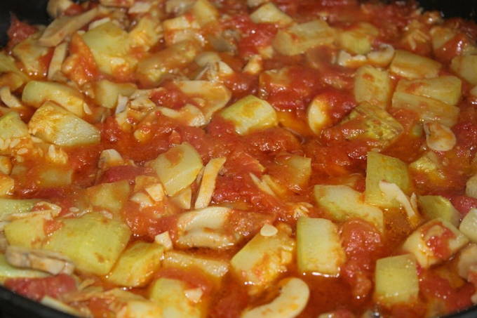Indien nodig kunnen verse tomaten worden vervangen door een paar eetlepels tomatenpuree. De kooktijd hangt af van de "jeugdigheid" van de courgette: rijpere courgettes hebben meer tijd nodig om te koken.