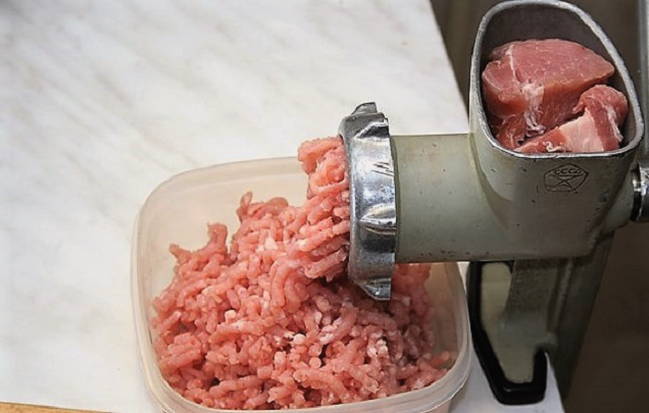 - Varkens- en rundvlees afspoelen en drogen met keukenpapier. Snijd in middelgrote stukken. Maal het vlees tot gehakt met een vleesmolen.