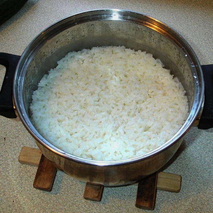 - We spoelen de rijst meerdere keren af, gieten het water in de gootsteen. Doe de rijst in een pan en voeg water toe. We zetten de container op de brander. We zetten de kachel aan. Kook de rijst tot hij zacht is.