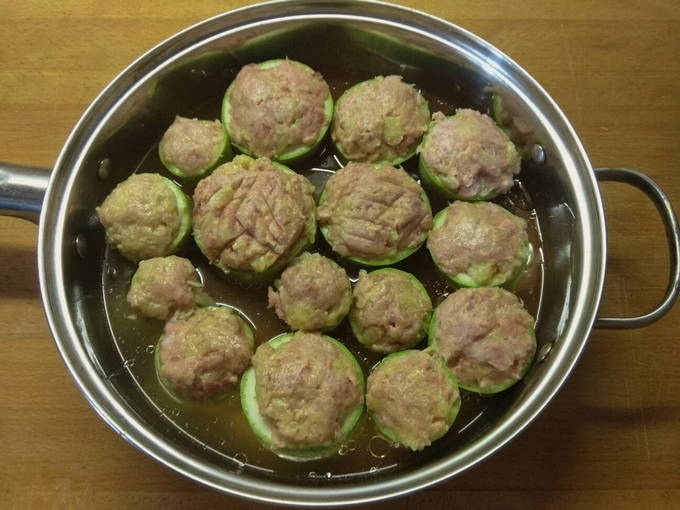 - Courgette "vormen" vullen we met gehakt. We plaatsen de courgette met de massa in een grote diepe pan. Giet wat water, zout. We zetten de container op het fornuis en zetten de apparatuur aan. Breng het gerecht aan de kook.