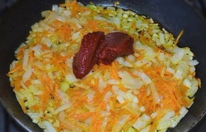 - Giet plantaardige olie in de pan. We zetten de container op de brander en zetten het fornuis aan. Wij warmen op. Voeg de ui toe en bak een paar minuten mee. Vervolgens sturen we wortelen. Bak nog 2-3 minuten. Roer constant. Tomatenpuree toevoegen. Roer en blijf bakken.