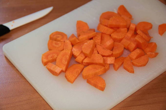 - Schil de uien en wortelen. We wassen de wortels met warm water en snijden ze samen met een mes. Snijd in halve ringen. Snijd de ui in blokjes.