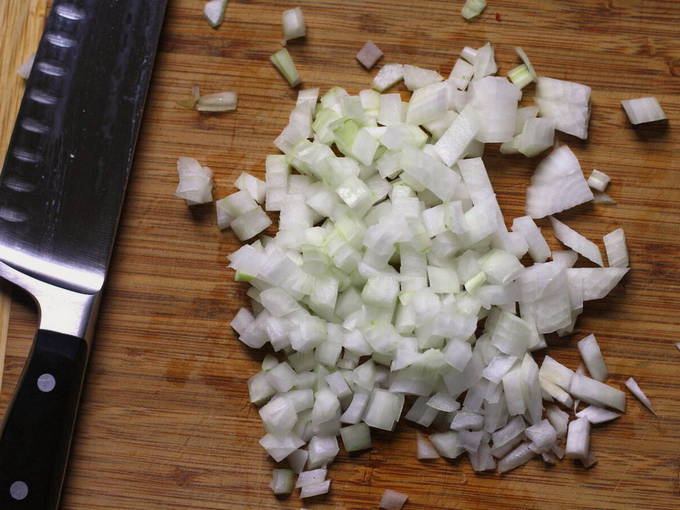 - We verwijderen de schil van de ui. We snijden het in blokjes.