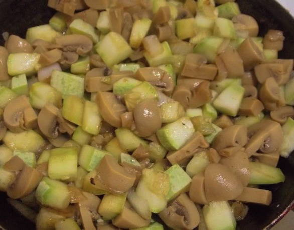 - We sturen courgette en champignons naar de pan. Meng de ingrediënten. We blijven frituren. Zout en peper naar smaak. Meng de massa opnieuw.