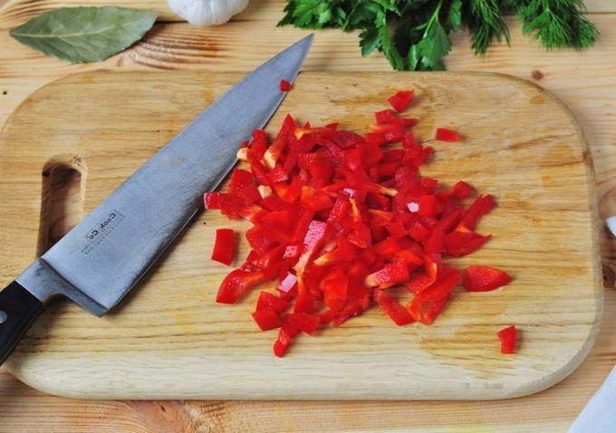 - We wassen de peper, drogen hem en snijden hem in de lengte in twee delen. We ontdoen ons van elk van de kernen. Spoel beide delen van de paprika opnieuw en snijd ze in kleine blokjes.