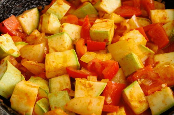 - Leg na 5 minuten peper en tomaten op de uien en courgette. Zout en bestrooi de massa met kruiden, meng en laat het mengsel op laag vuur sudderen.
